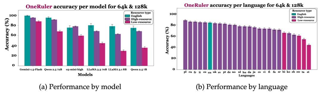 另一个研究论文同样支撑着类似观点,来自马里兰大学和微软的研究论文《One ruler to measure them all: Benchmarking multilingual long-context language models》,提出了包含 26 种语言的多语言基准 OneRuler,用于评估大型语言模型(LLM)在长达 128K 令牌的长上下文理解能力。