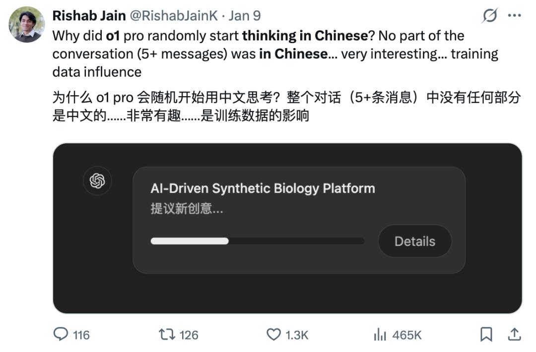 在今年 1 月份就有类似的事情发生,网友发现来自 OpenAI 的 o1-pro 模型也会随机出现中文思考过程。