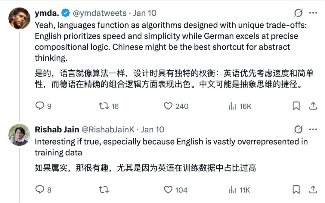 既然中英文都不是具有最佳大模型性能的语言,那大模型选择思考语言的方式并不是完全以效率为先。