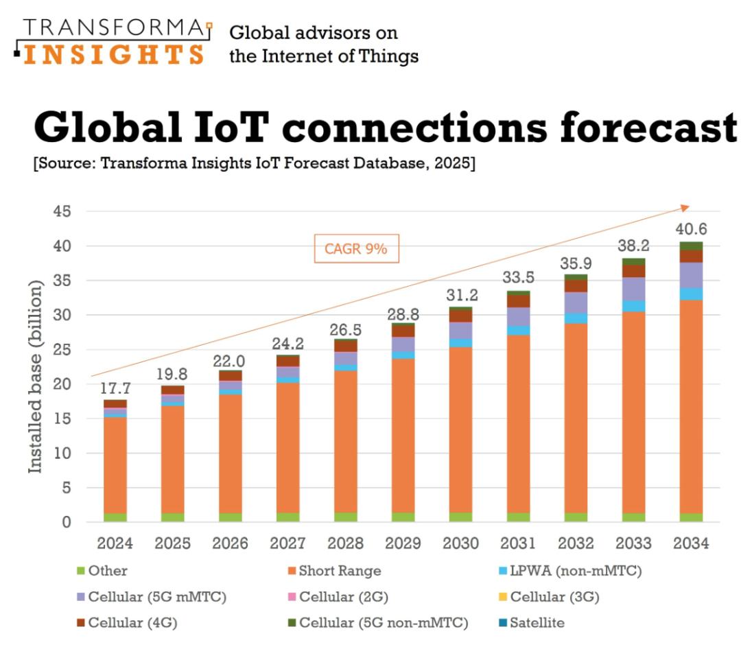 放眼未来,据Transforma Insights预测,到2034年,全球物联网连接总数将突破400亿,其中蜂窝物联网连接将增长超过三倍,达到67亿。