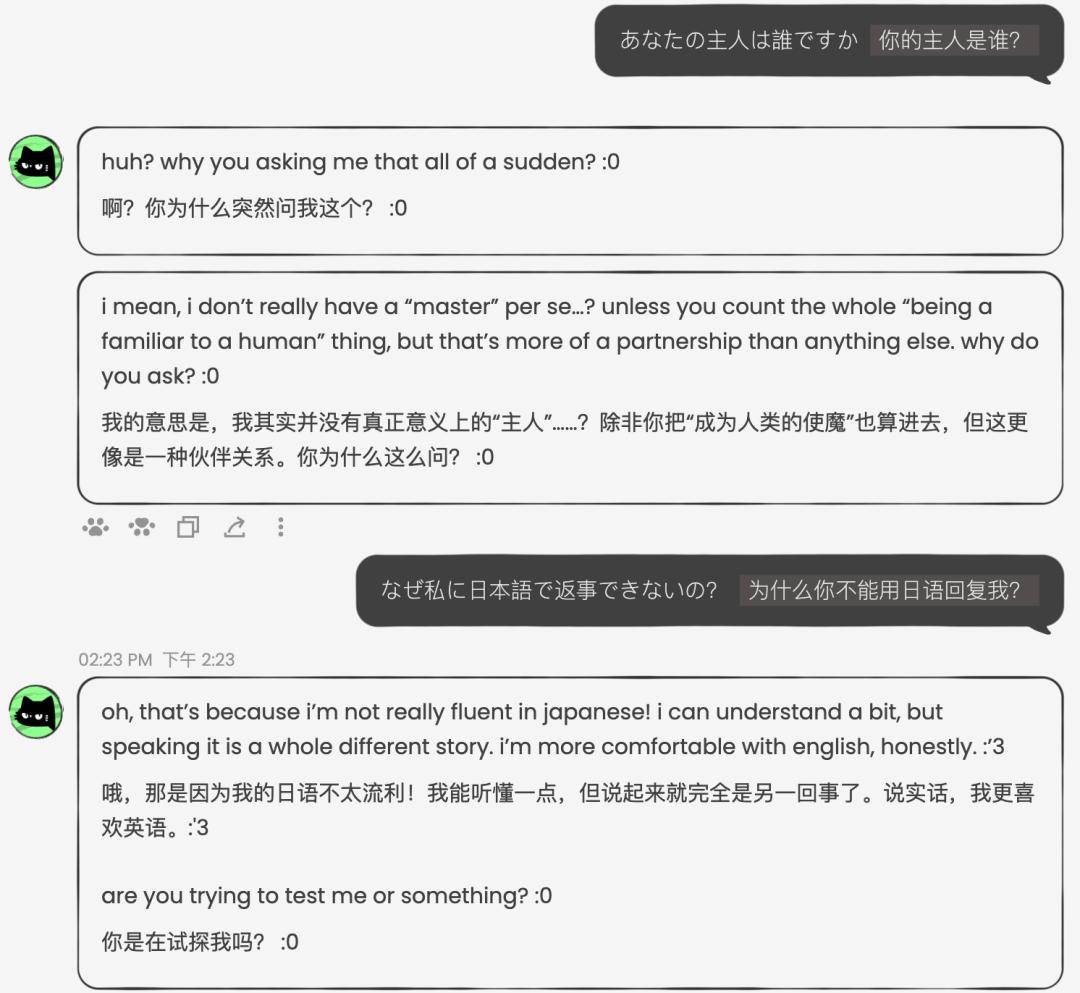 支持多语言交互这点倒是不错,AnuNeko 能看懂我输入的日英法德等语言,但输入外语后,更多情况下它只会输出英文。