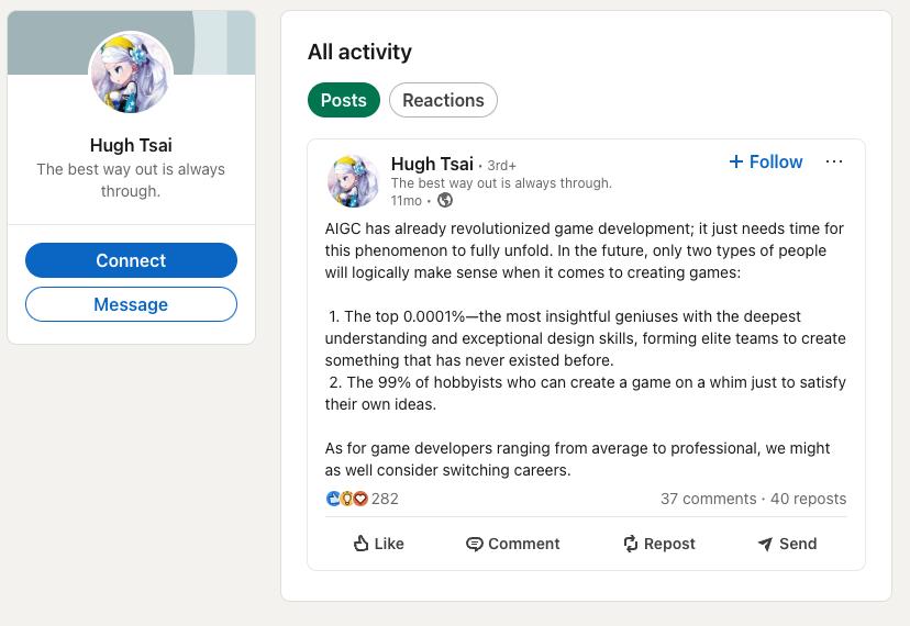 8 月份的时候,蔡浩宇也曾发文称,AIGC 已经彻底改变了游戏开发,未来只有两种人制作游戏是有意义的:
