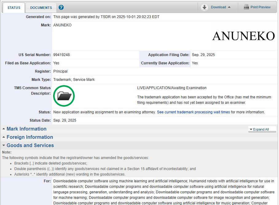 通过查询发现,这个 ANUNEKO 的商标已于今年 9 月提交美国专利局,涵盖软件、AI 角色、娱乐等领域,显然是是有备而来。