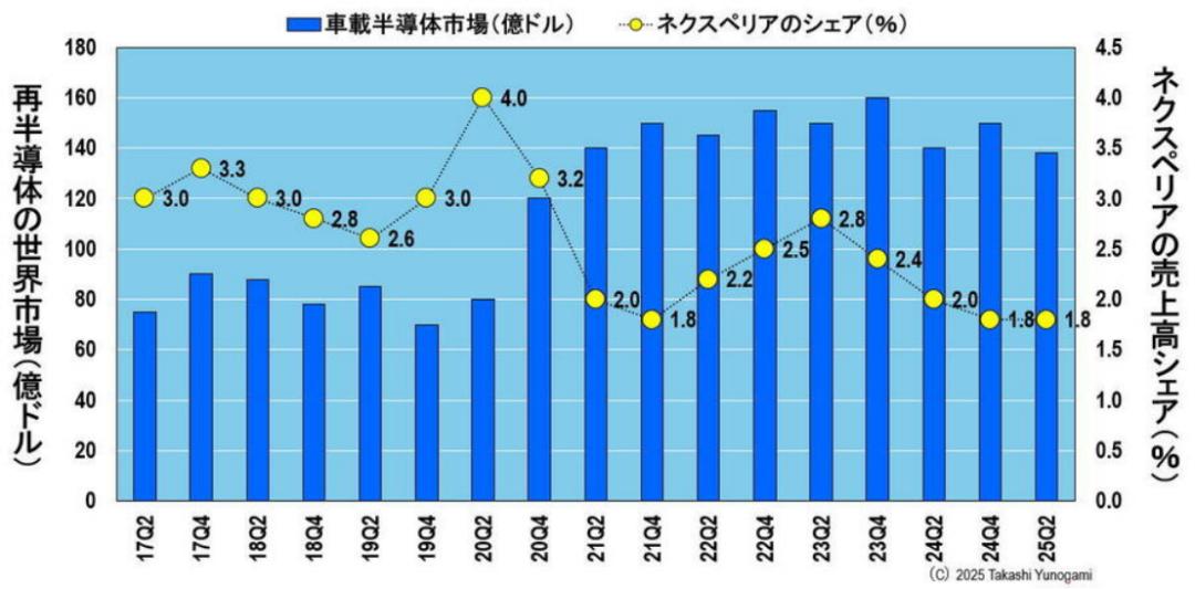 图 2:全球汽车半导体市场及安世半导体的全球份额。来源:作者根据 Claus Aasholm 的文章“荷兰划定了界限——还是设置了瓶颈?”(发表于《半导体商业智能》,2025 年 10 月 28 日)中的数据制作