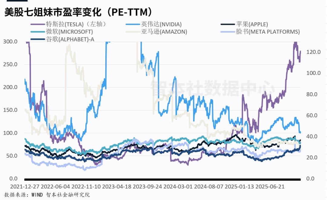 市盈率是动态的,成长性科技公司利润翻倍,会大幅度压低市盈率;而盈利预期或兑现,又可能大幅度提升股价,进而影响市盈率。例如,股价涨幅最大的英伟达,其利润增速是跑赢其股价增速的,过去五年其市盈率犹如过山车。微软、谷歌利润大致是其股价的一半,相当于抬高了其市盈率一倍。苹果利润增速则大幅度落后于其股价增速。后三家业务更加成熟的公司,难以通过利润快速增长来压低市盈率,因此这类公司市盈率一旦上去,股价回调压力会大一些。