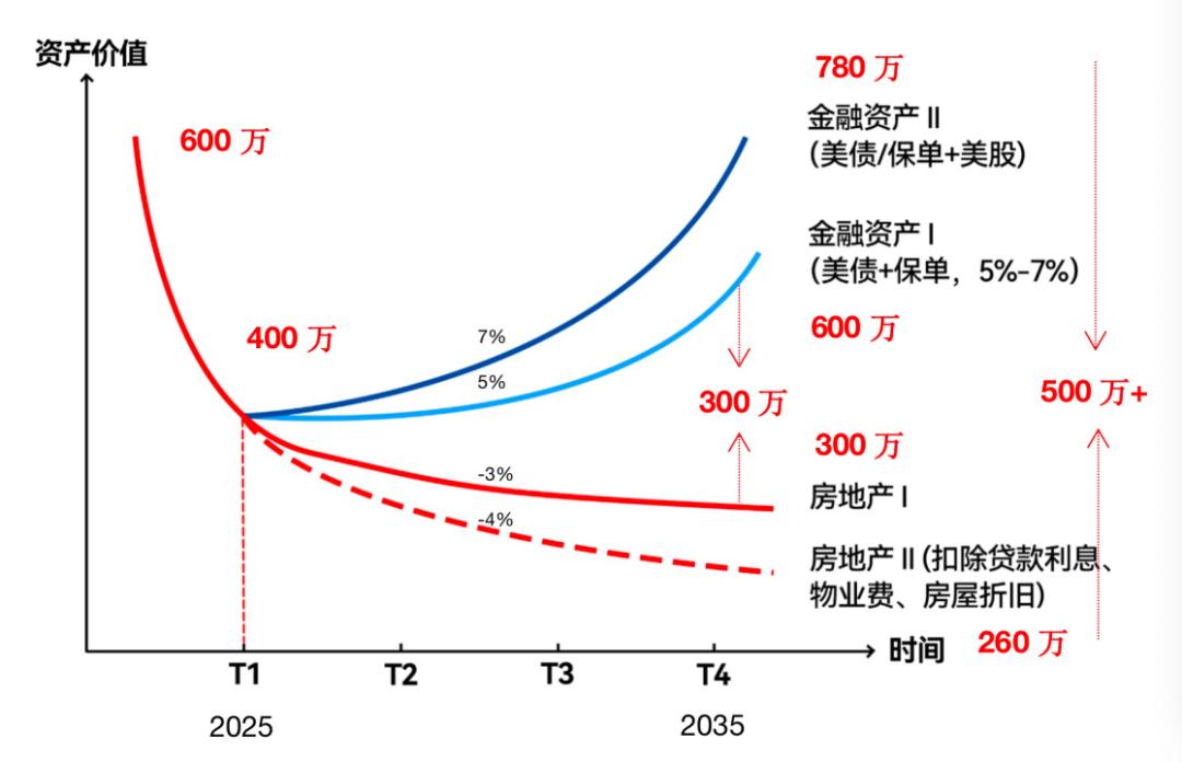 举个例子:2021年价值600万的房子,到2025年累计下跌30%多,只剩下400万。如果继续持有房地产,每年按3%速度下跌,10年后只剩下300万;如果加上利息、物业费、折旧等,每年按4%速度下跌,10年后只剩下260万。如果置换成时间资产,保守方案美债/保单组合,每年按5%速度增值,10年后达到650万,不仅追回了200万损失,还多赚了50万;如果选择风险高一点方案,美债/保单60%+美股40%,美股考虑纳斯达克指数ETF,这个时间资产组合每年按7%速度增值,10年后达到780万。可见,继续持有房地产与置换成时间资产组合之间,在10年后最小差距达到350万,最大差距超过500万。
