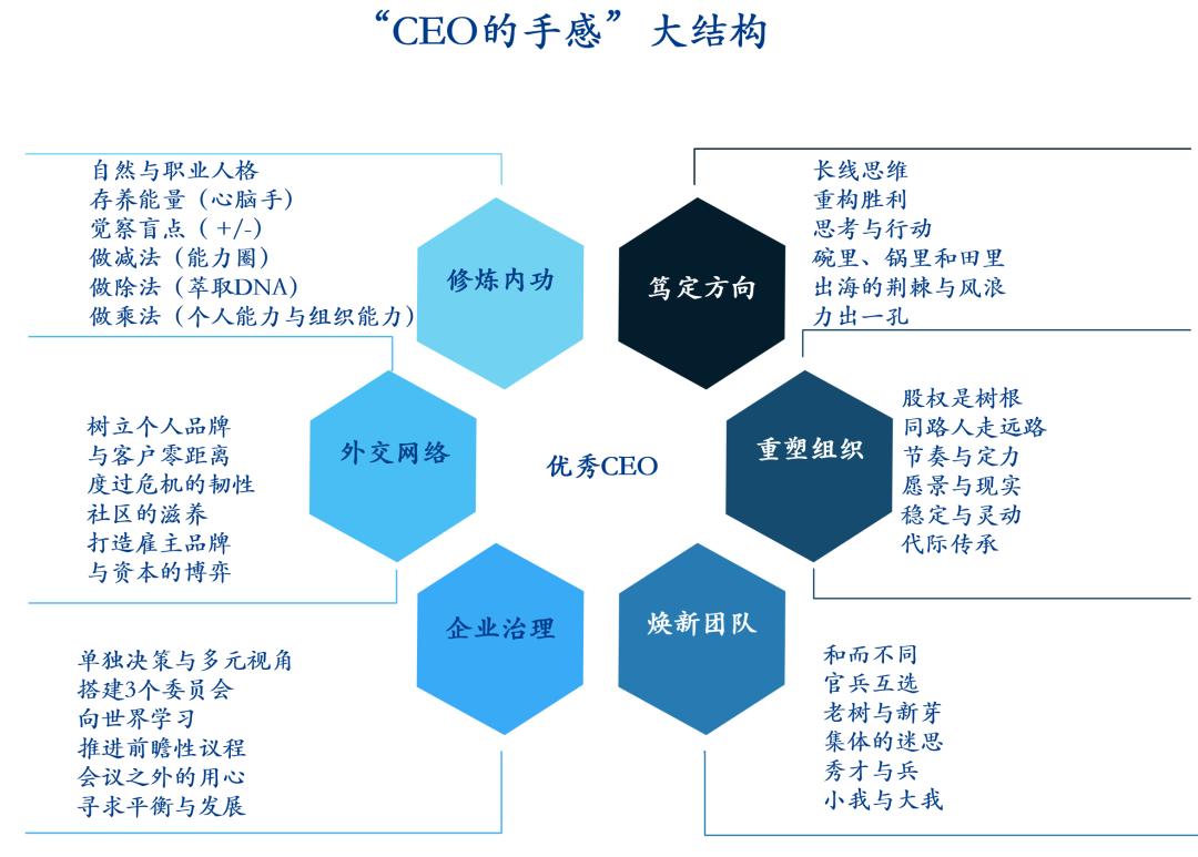 CEO是六边形战士,笃定方向、重塑组织、焕新团队、企业治理、外交网络和修练内功6大维度,在企业不同发展阶段各有侧重, 但缺一不可。