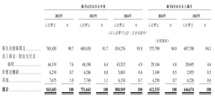 2022-2024年、2025H1,公司销售及营销开支分别为8.44亿元、7.52亿元、8.89亿元和6.45亿元,销售费用率高达50.6%、40.7%、40.2%和38.3%;其中,广告及推广开支占销售费用的90%以上。