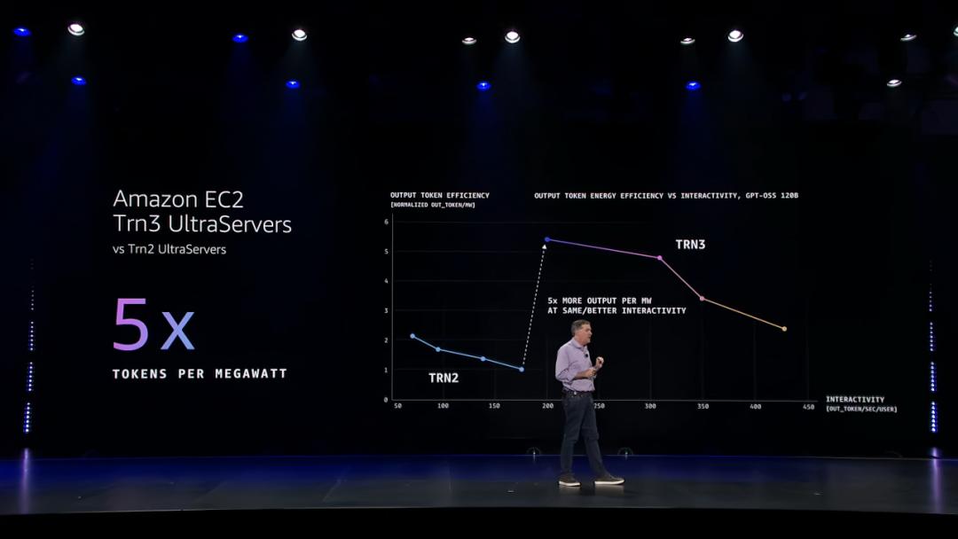 该服务器提供相比前代Trainium 2的4.4倍的计算性能、3.9倍的内存带宽提升,而能效比指标——每兆瓦电力处理的AI token数量——提升了5倍。