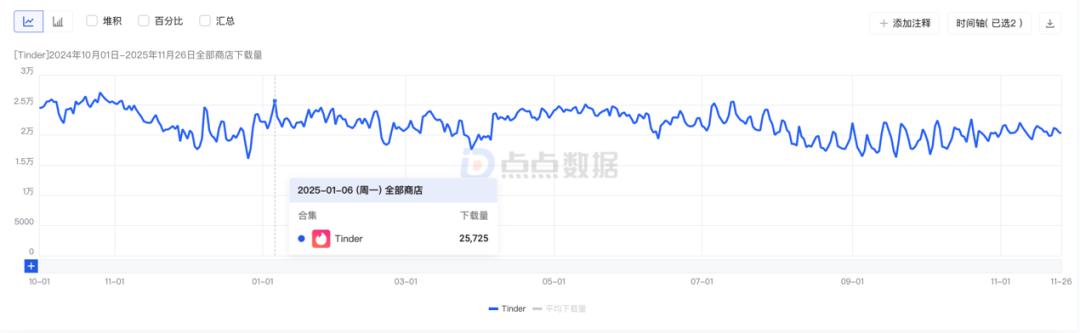 「Tinder」今年在美国地区的下载峰值出现在1月,甚至不是在情人节|图源:点点数据