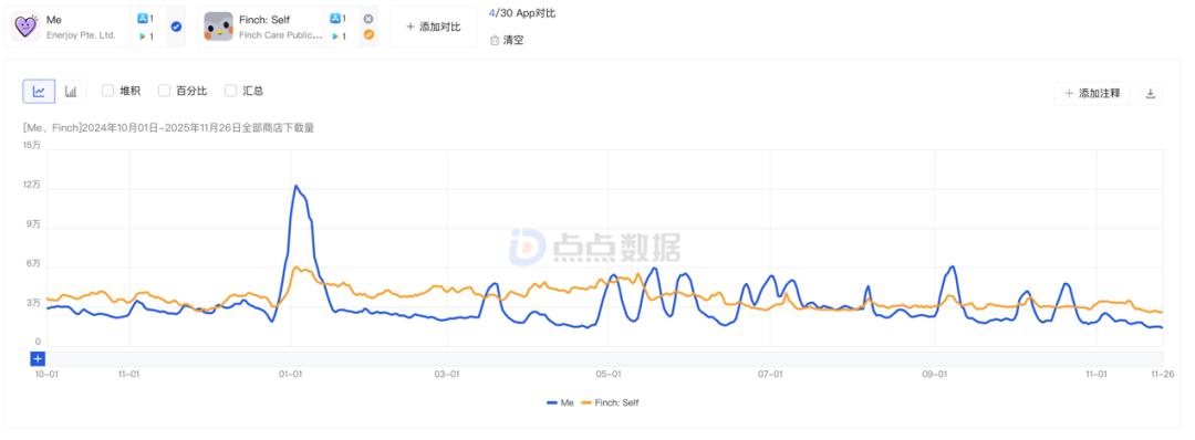 「Me+」和「Finch」全年下载量变化趋势|图源:点点数据