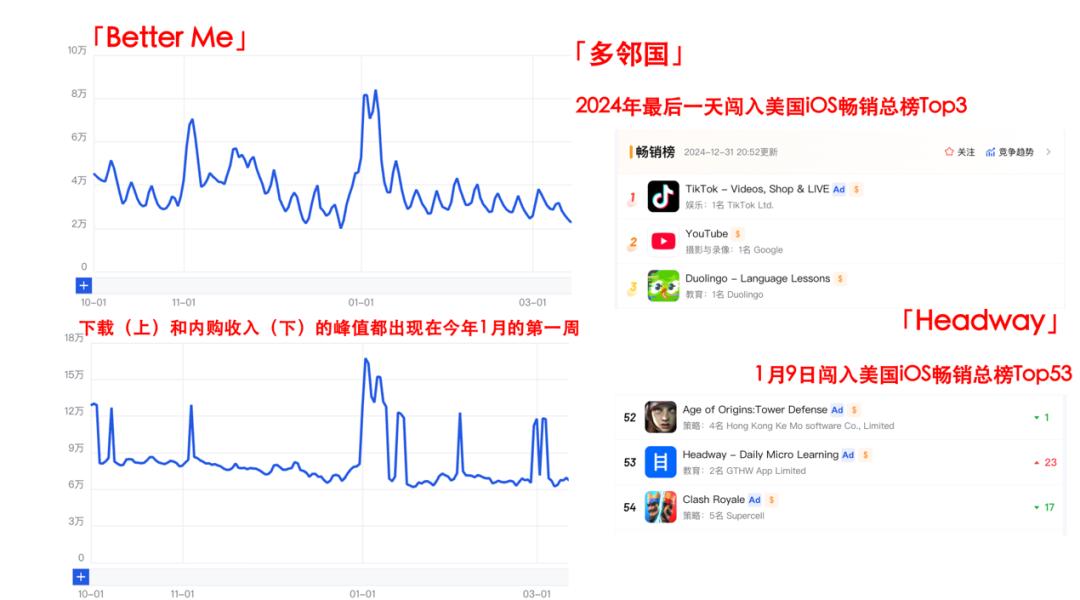 「Better Me」我们可以把它理解为海外的“Keep”,它属于赛道的头部应用之一,以丰富的真人健身教学内容为特色,并提供饮食管理、身体健康追踪等功能,单月流水在数百万美元量级。而它今年的下载和收入的峰值都出现在今年 1 月。学习类应用同样受益于这种“重启人生”的心态。2024 年的最后一天「多邻国」闯入美国 iOS 畅销总榜 Top3,为全年最好成绩,其当日内购收入达到了平日的近 4 倍;而主打“15 分钟读完一本书”的「Headway」则在新年第一周进入畅销总榜 Top100,恰好对应了人们常说的那句话,“重启人生的三件套,分别是运动、学语言和读书。”