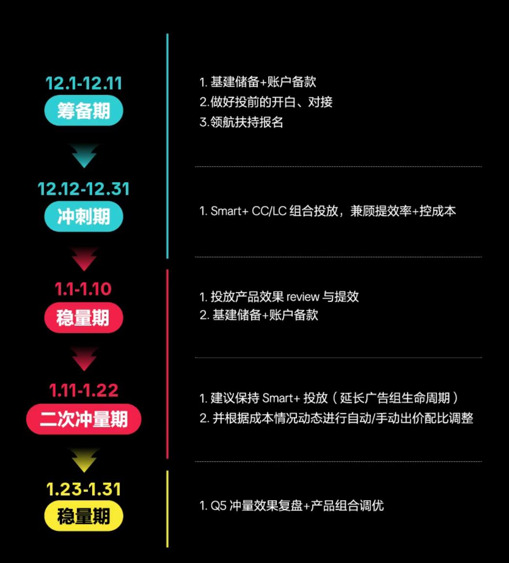 从平台侧来看,为了帮助广告主更好地把握这一增长窗口,TikTok for Business 将 12 月至整个 1 月的投放节奏拆解为 5 个阶段的增长曲线:12 月初也就是当下先做好预热,在假期氛围最浓的时期集中冲刺;跨年后保持曝光、二次冲量,当把节日期间激发的用户兴趣带入新的一年后,以更平稳的方式收住这一波增长。