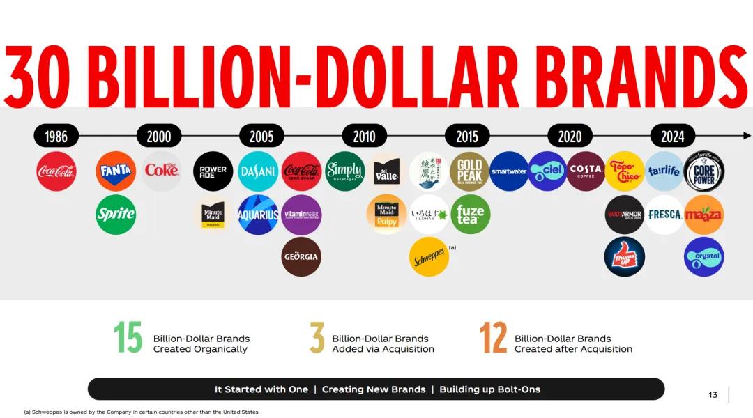 小食代介绍过,截至2025年,可口可乐公司一共拥有30个“10亿美元品牌”,其中一半都来自于收购。在这些并购而来的品牌中,有12个被收购时规模很小,但后来发展成为价值10亿美元的品牌,只有3个被收购时就已经是价值10亿美元的品牌。