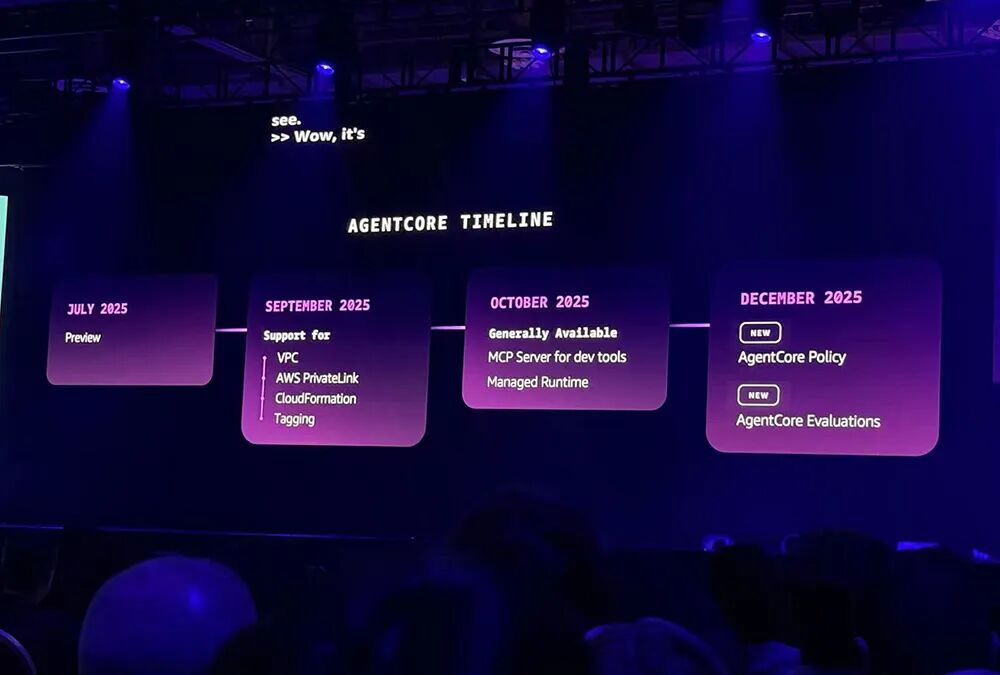 Amazon Bedrock AgentCore是一款专为安全、大规模构建和部署智能体而设计的智能体平台,兼容各类框架和模型,于今年7月在AWS纽约峰会上首次发布预览版,随后快速迭代,10月已正式全面可用。