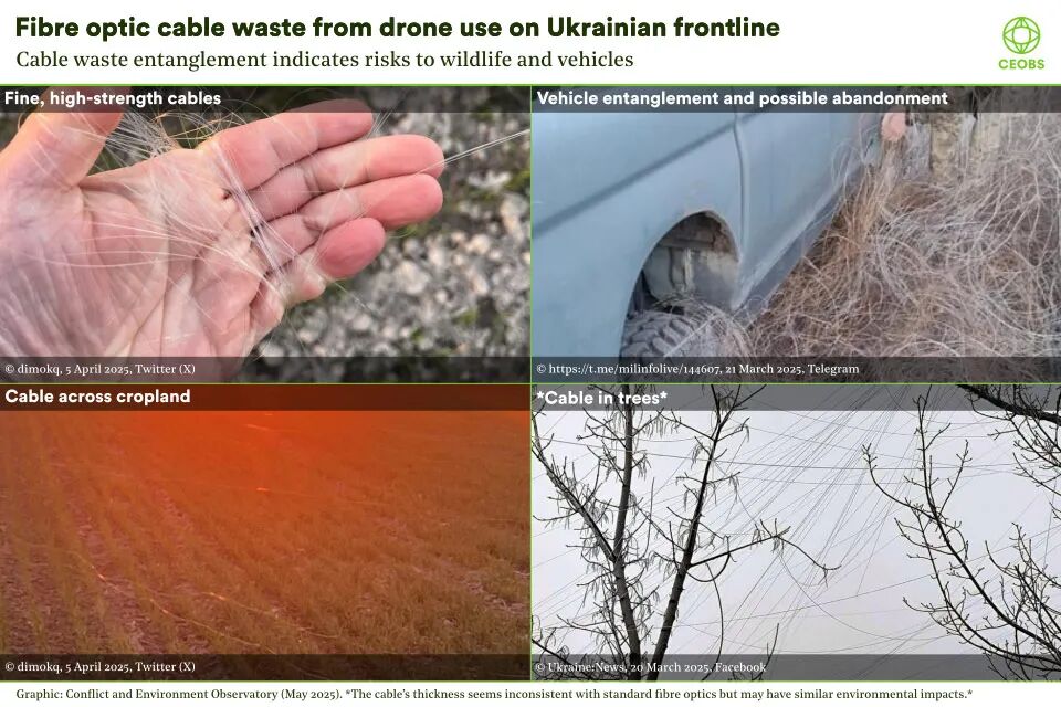 一个FPV无人机的光纤就长达5-50公里,坠毁或者爆炸后即被遗弃。目前,乌克兰的田野、森林、河流和村镇正被数万公里长垃圾线缆编织的庞大人造“蛛网”覆盖。除了对农业有巨大影响外,也会对包括濒危鸟类、蝙蝠在内的物种(甚至儿童)造成缠绕致死风险。
