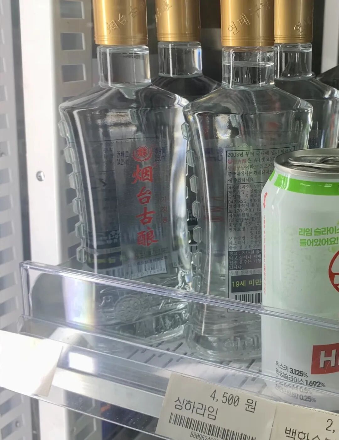 当然,茅台、五粮液、国窖1573等高端白酒在韩国也有一定的认知度。在韩国,它们的定位还是高端商务宴请中彰显身份的符号,酒类博主也会买上几瓶对它们进行测评,但真正渗透到市井巷陌的,依然是售价10000韩元左右(合人民币约48元)的烟台古酿。