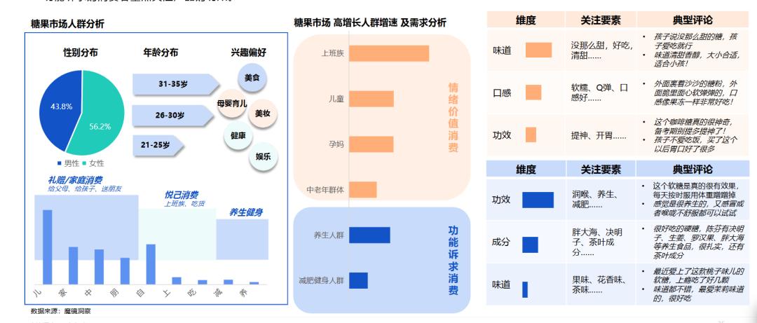 魔镜洞察研究数据显示,目前糖果消费主力人群年龄介于21岁至35岁区间,消费场景主要是礼赠/家庭消费、悦己消费以及养生健身。就消费群体来看,女性依然是糖果产品的消费主力,所占比重高达56.2%,远高于男性所占比重43.8%。