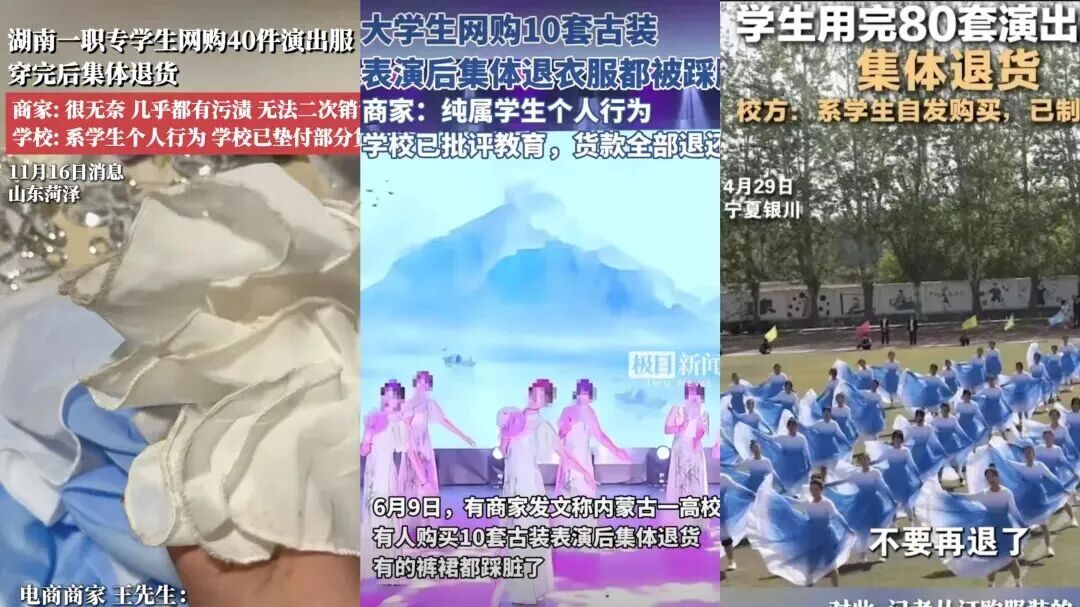 曾经就有不少新闻爆出,学校演出后,学生把穿过的演出服拿去退货,因为有了很明显的使用痕迹,导致商家叫苦连天。