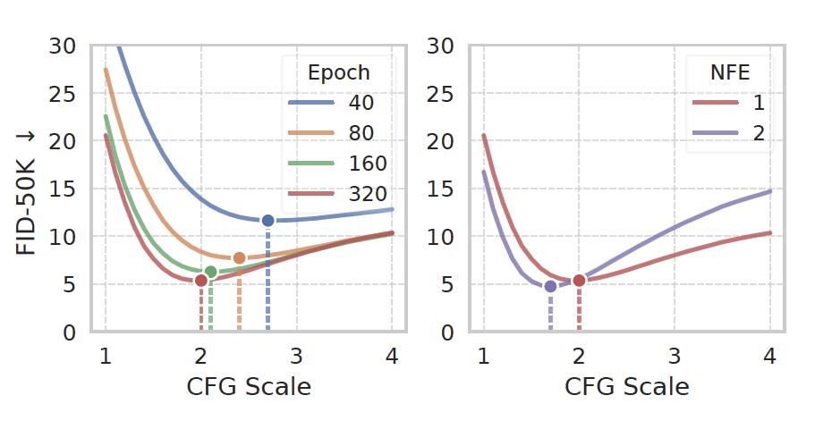 原始MeanFlow框架的一大局限是:为了支持单步生成,无分类器指导(CFG)的指导尺度在训练时必须被固定,这极大地限制了在推理时通过调整尺度来优化图像质量或多样性的能力。