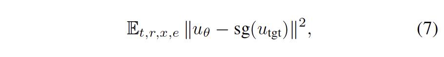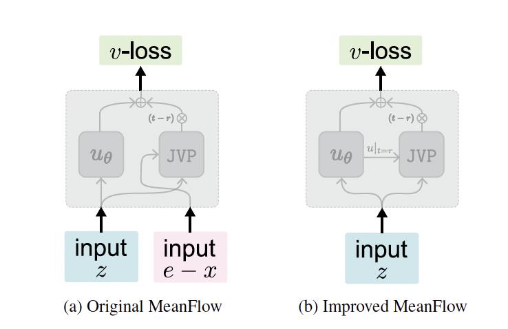 在原始的MeanFlow (MF) (上图左)中,其直接最小化平均速度的损失。其中,Utgt是根据MeanFlow恒等式和条件速度e-x推导出来的目标平均速度。
