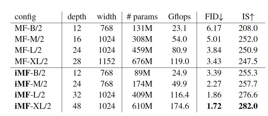 这使得iMF在性能提升的同时,模型尺寸得到了大幅优化,例如 iMF-Base 模型尺寸减小了约1/3(从 133M 降至 89M),极大地提升了模型的效率和设计灵活性。