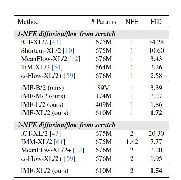 iMF-XL/2在1-NFE下的FID达到了1.72,将单步生成模型的性能推到了一个新的高度。