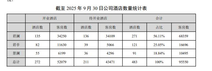 截至今年9月30日,君亭酒店公司旗下君澜、君亭、景澜三大酒店品牌合计开业数量272家、客房数52079间。加上待开业项目,合计酒店总数达483家,客房总数超过95000间。