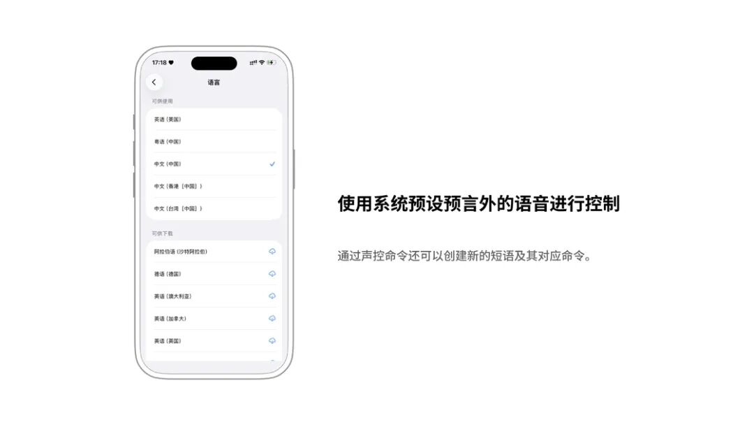 「人声快捷指令」可以创建特定声音执行的具体快捷操作。例如,可以设置 iPhone 每次听到某个语音时直接打开付款码。这项功能是为严重非典型语音人士提供通过特定语音来让 iPhone 执行操作而设计的。