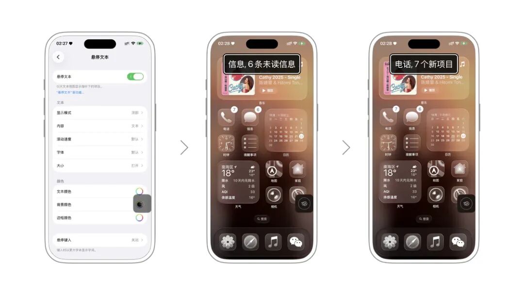 始终显示音量控制:在使用 iPhone 内置扬声器或连接耳机时,锁屏的正在播放实时活动卡片会一直显示音量条。
