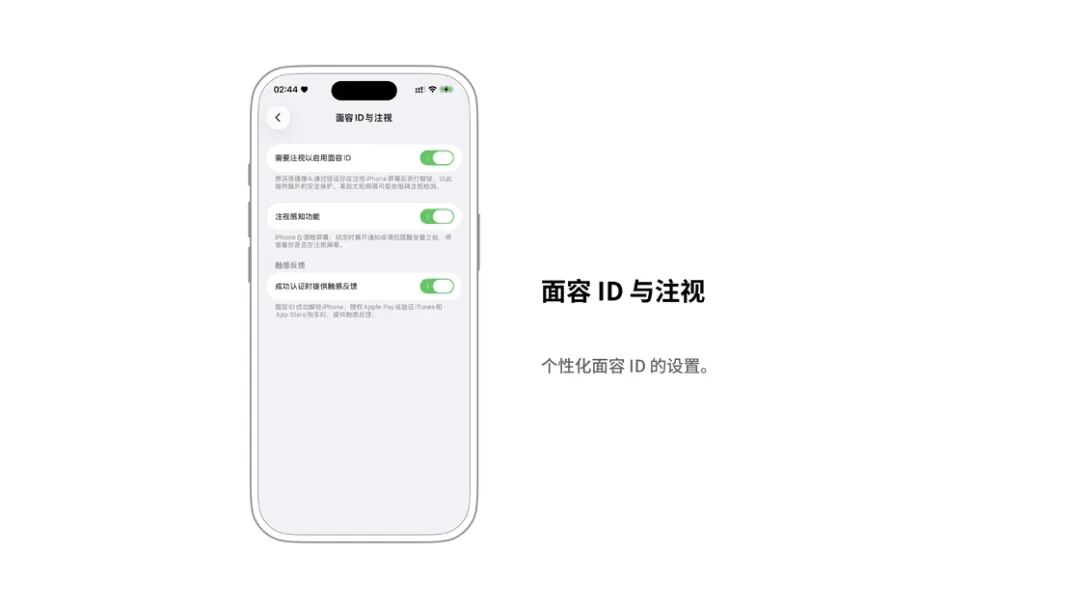 你手中的设备配备了 Face ID 的设备知道你是否在看着它,从而提供一些隐私上的保护和人性化的使用体验。你可以在设置 > 辅助功能 > 面容 ID 与注视找到相应的设置页,包括了三个开关:
