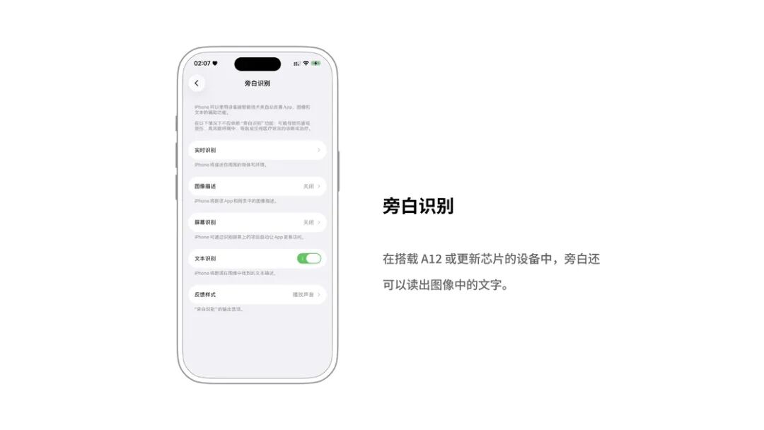 为了让「旁白」这一功能更适合不同用户的需求,Apple 提供了大量可调节参数,比同属语音功能的 Siri 更加丰富,如语速、语言、音调等。此外,得益于 iOS 设备近年在机器学习方面的进步,「旁白」也可以通过算法描述已选中的图像;在搭载了 A12 或更新芯片的设备中,旁白还可以读出图像中的文字。