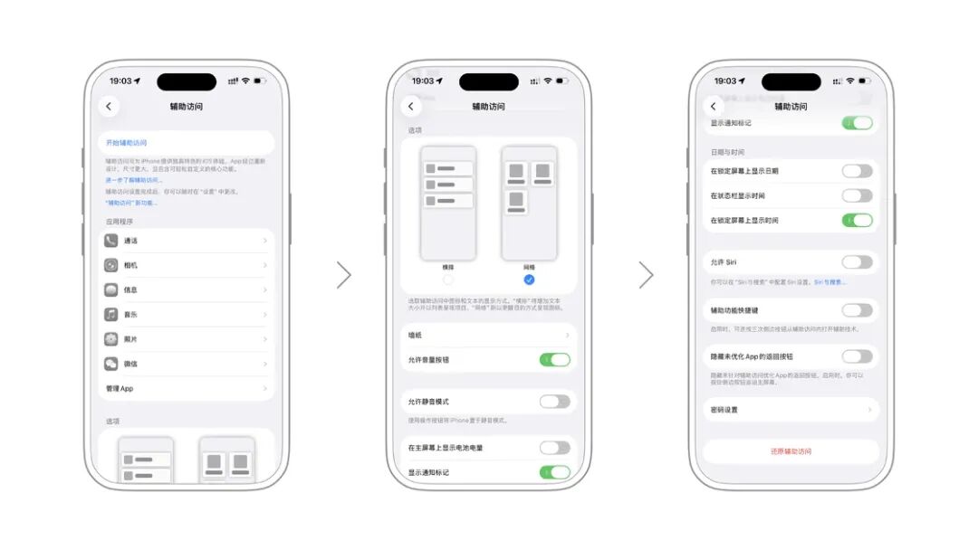 可以将设备停留在某个 App 中,只需要到设置 > 辅助功能 > 引导式访问这里打开开关,然后前往想要停留在的 App(「设置」系统应用除外),连按三次侧边键就可以进入「引导式访问模式」,第一次开启应该要设置密码。