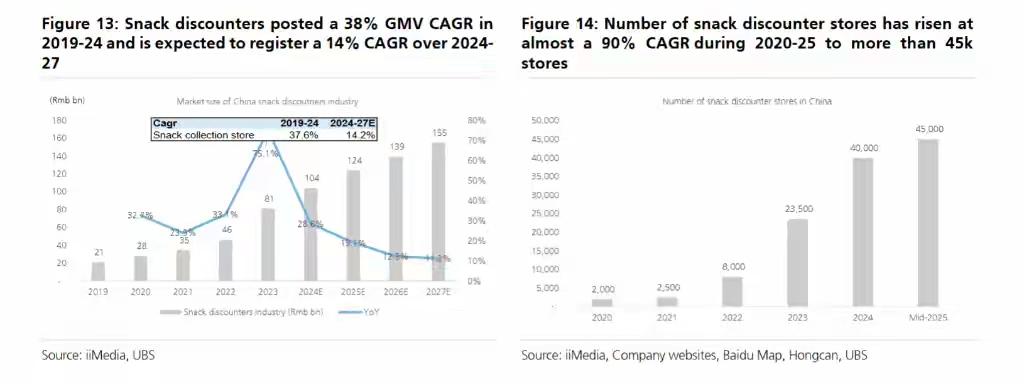 艾媒咨询(iiMedia)数据,零食折扣店面在2019-2024年间实现了高达38%的销售额复合年增长率。瑞银预测,在2024-2027年间将继续以14%的复合年增长率高速增长,未来门店总数有望突破7万家。