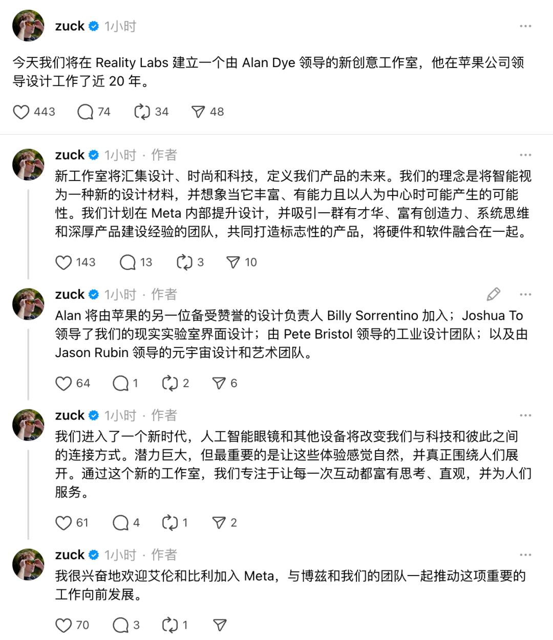 但问题是,对比讲究精雕细琢、追求极致的苹果,Meta 的产品能用,但总是差点意思,所以这次挖来 Dye,扎克伯格显然是想弥补这块短板。