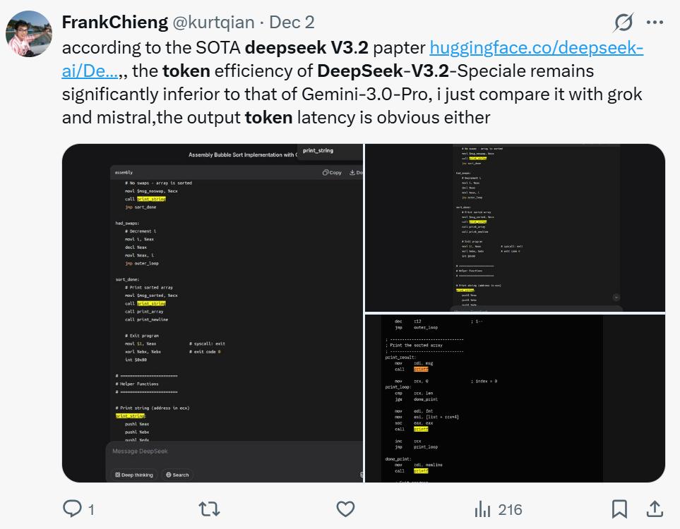 报告中提及,DeepSeek-V3.2-Speciale 的 token 使用效率明显低于 Gemini-3.0-Pro。