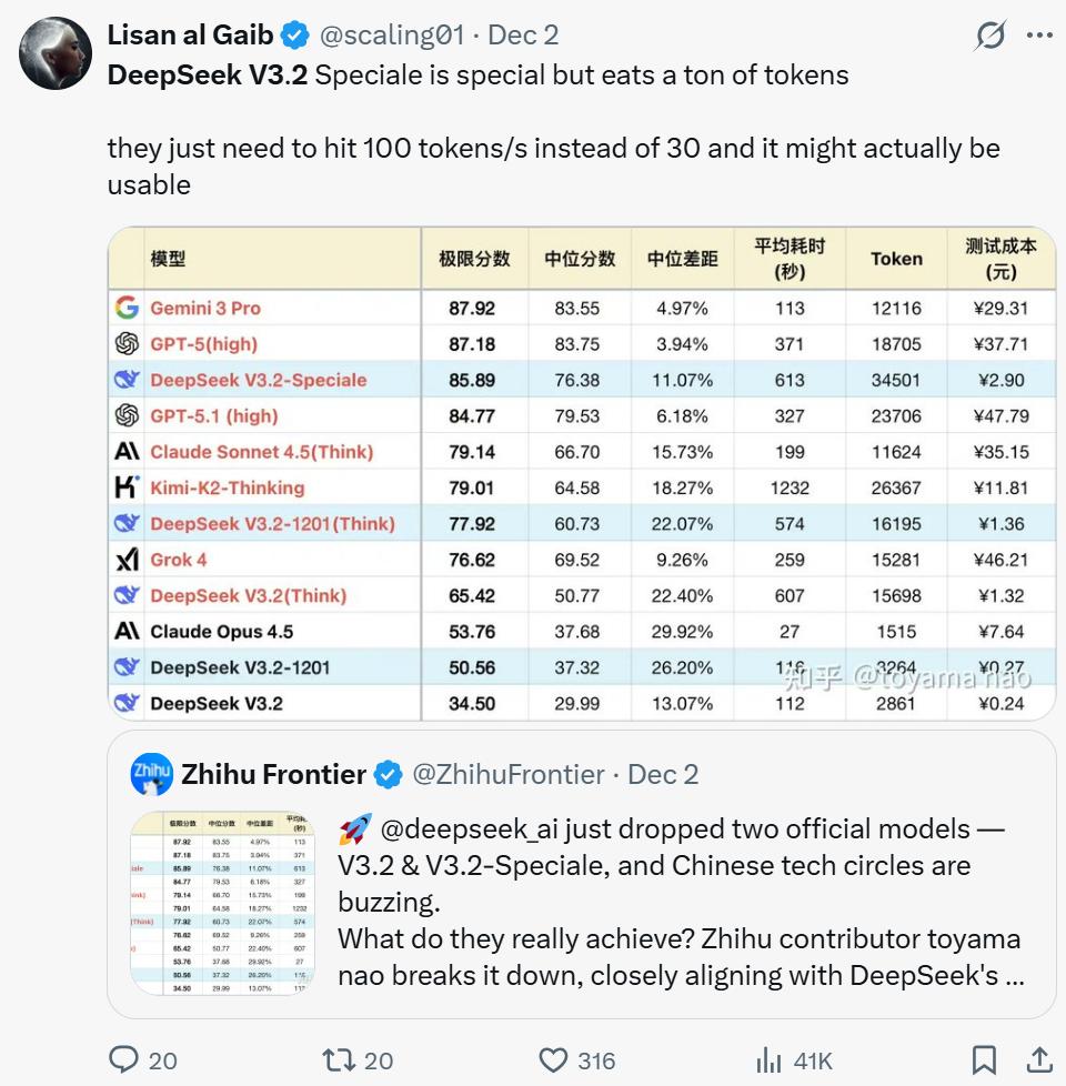 实际上,DeepSeek-V3.2 在 Token 消耗方面的异常表现,已经被不少用户与研究者观察到。有社区网友指出,Speciale 版本的确具备极强的推理能力,但在实际使用中 Token 消耗速度如喝水般迅速,显著高于同类模型。他们评价,如果 DeepSeek-V3.2 Speciale 的生成速度能够从当前的大约 30 tokens/s 提升至 100 tokens/s 左右,那么其综合可用性和使用体验都将获得大幅改善。