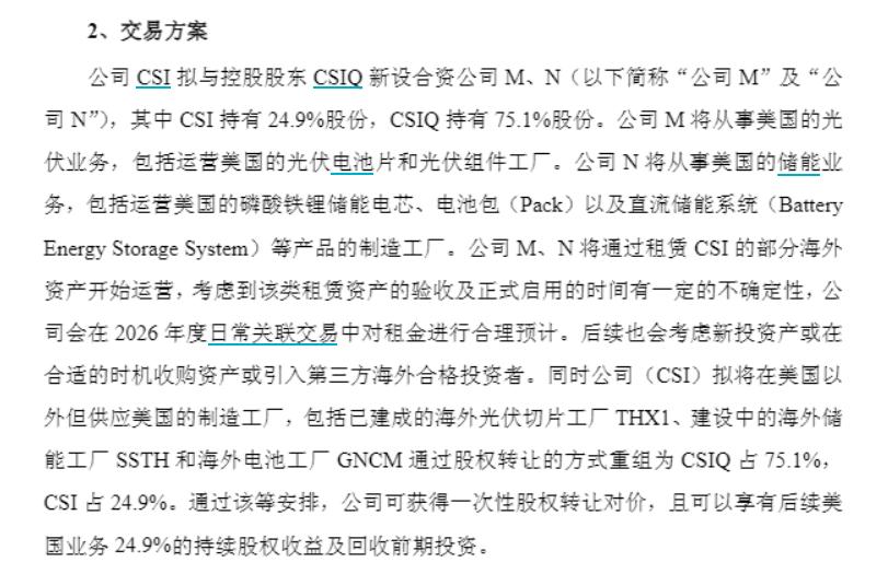 11月30日,阿特斯(688472.SH)发布公告称,拟与控股股东Canadian Solar Inc.(简称CSIQ)新设合资公司M和N,分别负责美国光伏及储能业务。其中,阿特斯持股24.9%,CSIQ持股75.1%,同时亦按上述比例重组供应美国市场的三家海外工厂股权结构,涉及一次性股权转让对价3.52亿元。未来公司M和N将通过租赁CSIQ的部分海外资产运营。