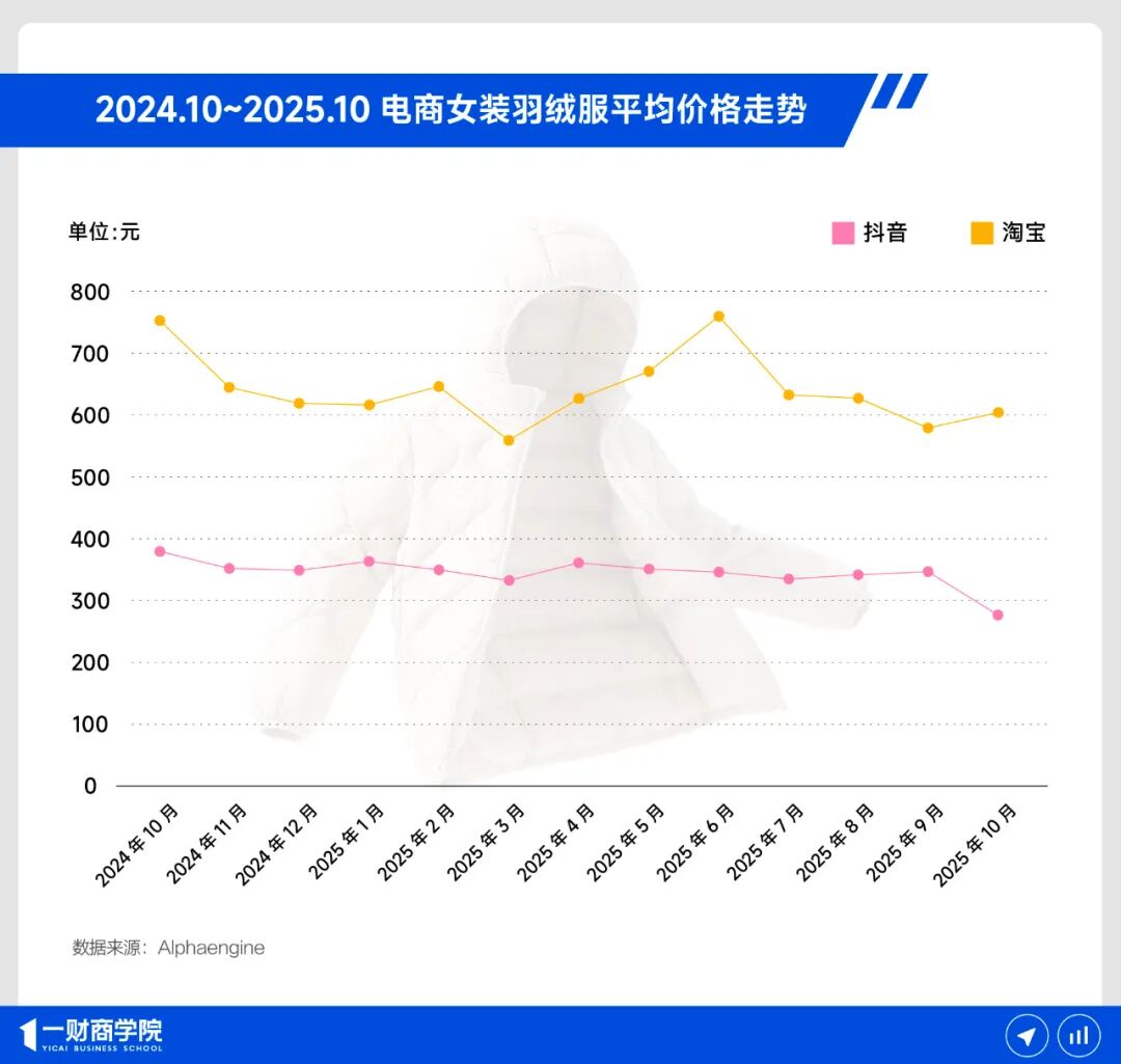 在研究300元这个价格带时,我们还发现了一个非常有意思的现象:羽绒服客单价最高的月份,往往不是深冬,而是夏天。Alphaengine的数据显示,2025年10月抖音、淘宝的女装羽绒服均价和6月相比分别下滑21%和18.7%。