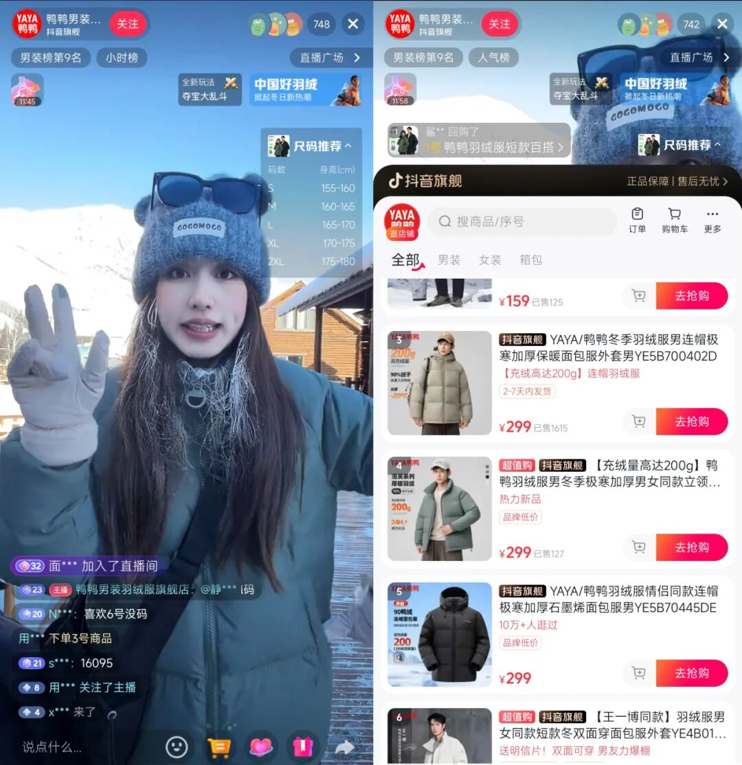 另一种营销打法在于卷场景,在户外博主们穿着上万元的始祖鸟、加拿大鹅穿越雪山的时候,平价羽绒服品牌们也将直播间搬到了户外。鸭鸭将直播间常驻在了零下14℃的冰天雪地里,用硬核的极限场景直观地传递给观众:自己的抗冻性能完全不逊于户外专业品牌,但价格只有他们的十分之一,甚至是二十分之一,力图展现出肉眼可见的性价比。