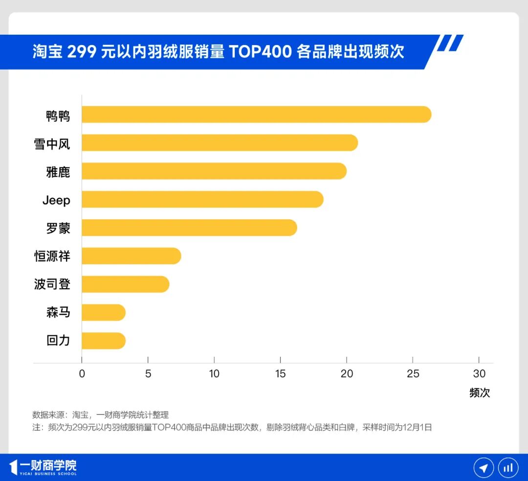 在淘宝筛选299元以下销量最高的TOP400羽绒服——刨除知名度不高的“白牌”和羽绒背心之外,会高频看到几个眼熟的品牌:鸭鸭、雪中飞、雅鹿,还有从户外领域跨界杀进来的Jeep。