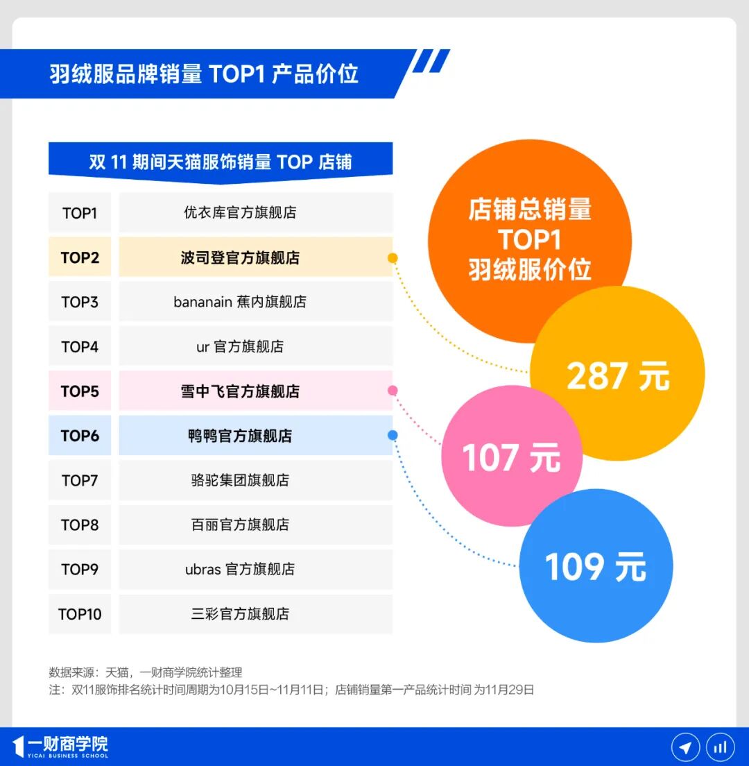 打开淘宝我们会发现,销量排名前5的羽绒服爆款,有3件都低于300元。在天猫双11服饰销量排行榜上,波司登、雪中飞、鸭鸭这几个专业羽绒服品牌,店内销量排名第一的羽绒服全都低于300元。