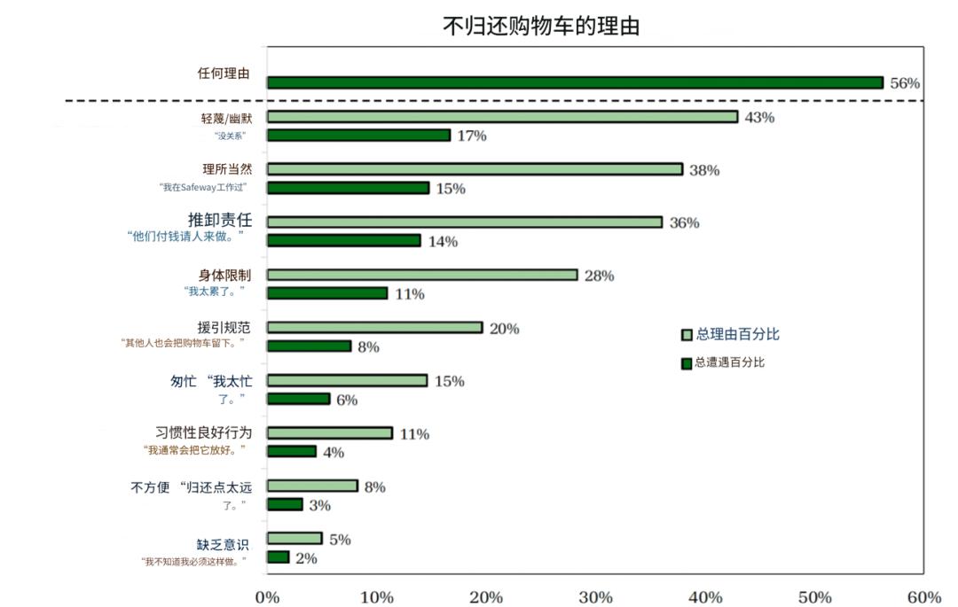 心理学家兼行为科学家汉娜·B·沃尔德福格尔对此类话题很感兴趣,在看完戴维斯的564个视频后,采用归纳法统计分析了一下人们被要求归还购物车时的第一反应以及不归还购物车的理由。