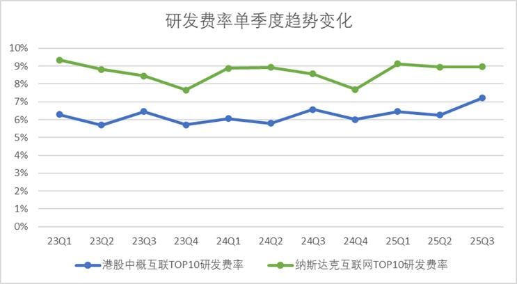 港股互联网巨头的研发费率长期稳定在6%左右,今年第三季度因AI投资增加明显抬头,突破7%,两者差距正在逐渐收窄。