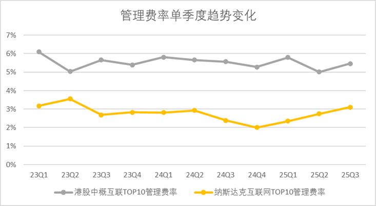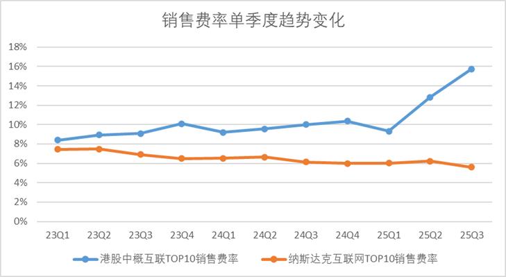 反观纳斯达克龙头互联网企业,市场竞争环境相对温和,整体销售费用率从2023年第一季度的7.4%下降至2025年第三季度的5.6%。