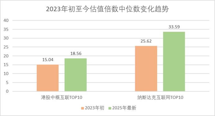 然而,纳斯达克互联网龙头企业的估值水平则有显著上升:2023年初其前十大估值中位数为26倍,目前已达34倍,估值涨幅明显高于中概互联。