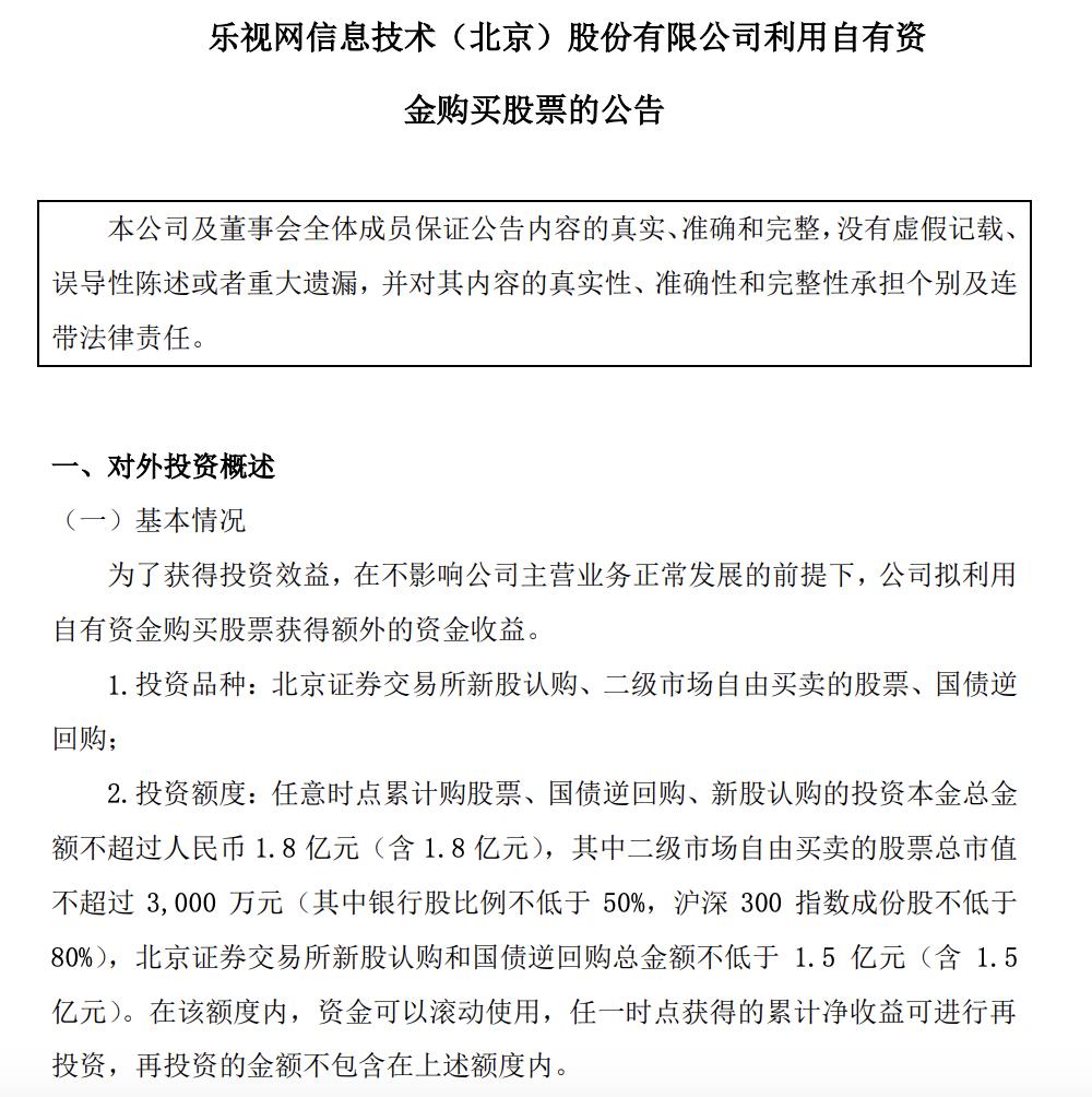 根据乐视网发布公告显示,公司拟利用不超过1.8亿元自有资金进行证券投资,投资范围包括北交所新股认购、二级市场自由买卖的股票以及国债逆回购。