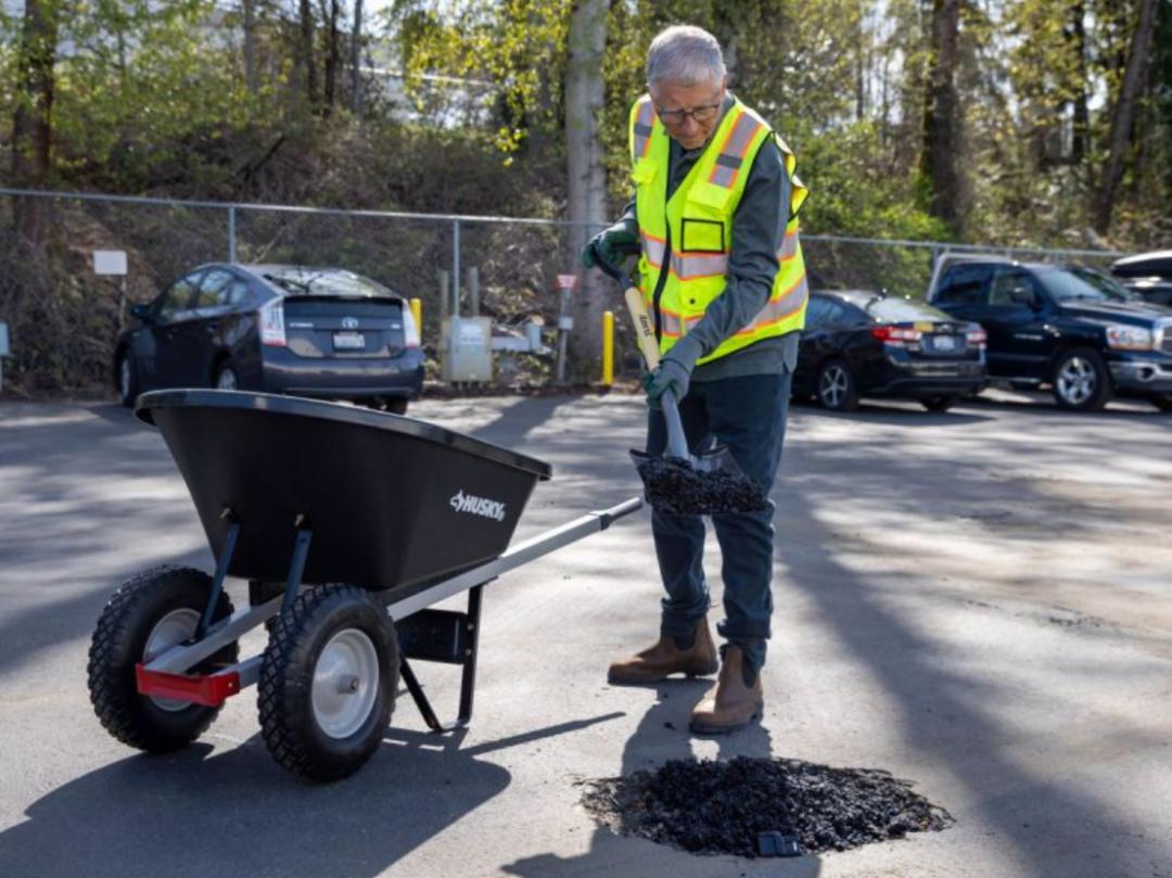 只见他推着独轮车,用铲子铲起固体碳合成的沥青,填满了停车场里的大坑。