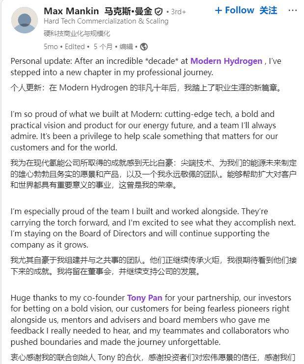 所以在Modern Hydrogen创立初期,盖茨就给予了支持,持续关注公司动向,后来领投了1亿美元。