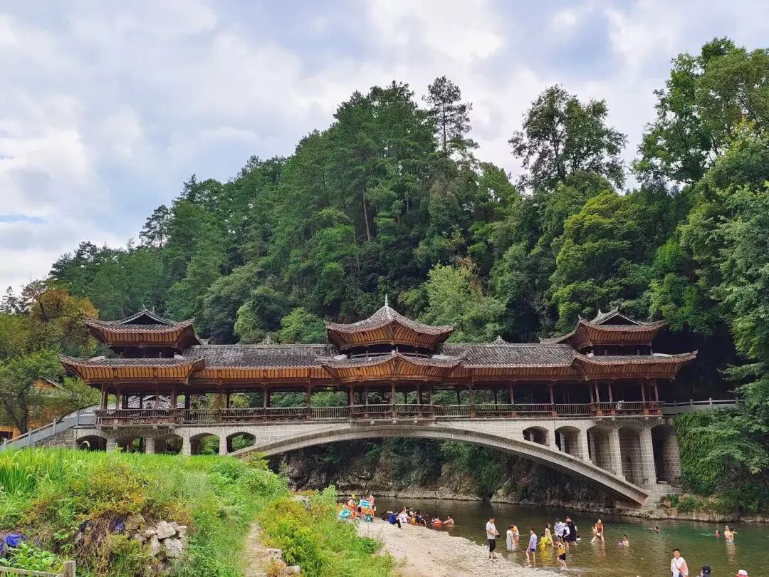 在摆渡车站前的风雨桥上,我见到了惊喜。桥下流水潺潺,几排苗寨建筑在岸上层层叠叠。水流所向,延伸至远山,与蓝天白云相交,我所要去的朗德苗寨就在云深处。